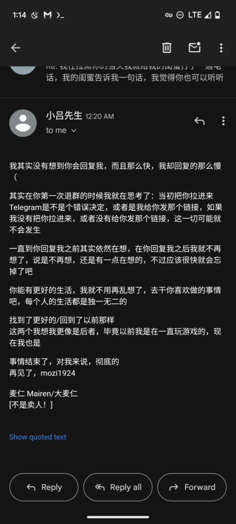 而这一次,我主动找到Mairen,我希望能他能翻篇重新开始,而不是创建小群就完了,我希望他能解散现有的群,定位一个明确的目标,再创建一个新群,所以我首先先在他的小群里提出意见并希望获得群友的观点,当我看到并没有群友提出异议并建议我主动私聊Mairen的时候我便去做了,因为这条消息我通过已读里看到了Mairen已读,所以我便私聊了他,问:“我们现在可以商议一些事情么?”并等待,而他,还在折腾他那该死的DNS服务器,所以,我继续等待,而我等待这么久,所换来的,是两个字:“不行”,我当时都被气笑了,所以我便先退出了大群和小群,希望Mairen能够引起重视,并在我的个人频道里发布了本文开头的那条消息,我继续等待,不过仍然没有收到任何回应,我通过我频道的评论区已读列表确认了Mairen已经看到了这条消息,所以我便作出了一个我觉得唯一能让我觉得好受的决定,拉黑,退群我并不人为我的逻辑有什么错误,我觉得这样做能让我好受点,所带来的结果就是我再也没有觉得我是谁谁谁的衬托,我不用再等待有人为我作出回应,我能够更加专注的做我自己的事情,我无需再等待,我想做什么就做什么,我去了重庆,而不是等待一个我从未见面的人来找我。